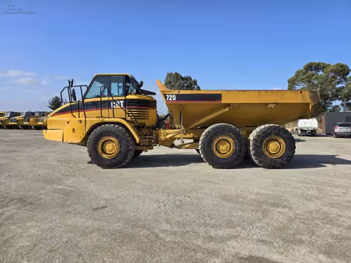 The Cat 725 is a dependable 6×6 articulated hauler that’s been around since 2001—solid, simple, and rugged. Think 26.5 US tons (24 t) of payload, a 15 m³ (18.8 yd³) dump body, and a 309 hp Cat C11 ACERT diesel engine. Built for serious cycles with minimal fuss.