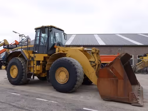 The Cat 980 (2006–2014) in G and H trims is a large production loader built for quarries, load-out yards, and bulk material handling. Operating weights run 29.4–30.5 t, buckets hold 4.6–6.1 m³, and net power is about 250–274 kW (335–367 hp) from the Cat C15 ACERT. The G series delivers proven mechanical reliability with Tier 3 compliance, while the H adds improved fuel economy, load-sensing hydraulics, and upgraded cab comfort for long shifts.